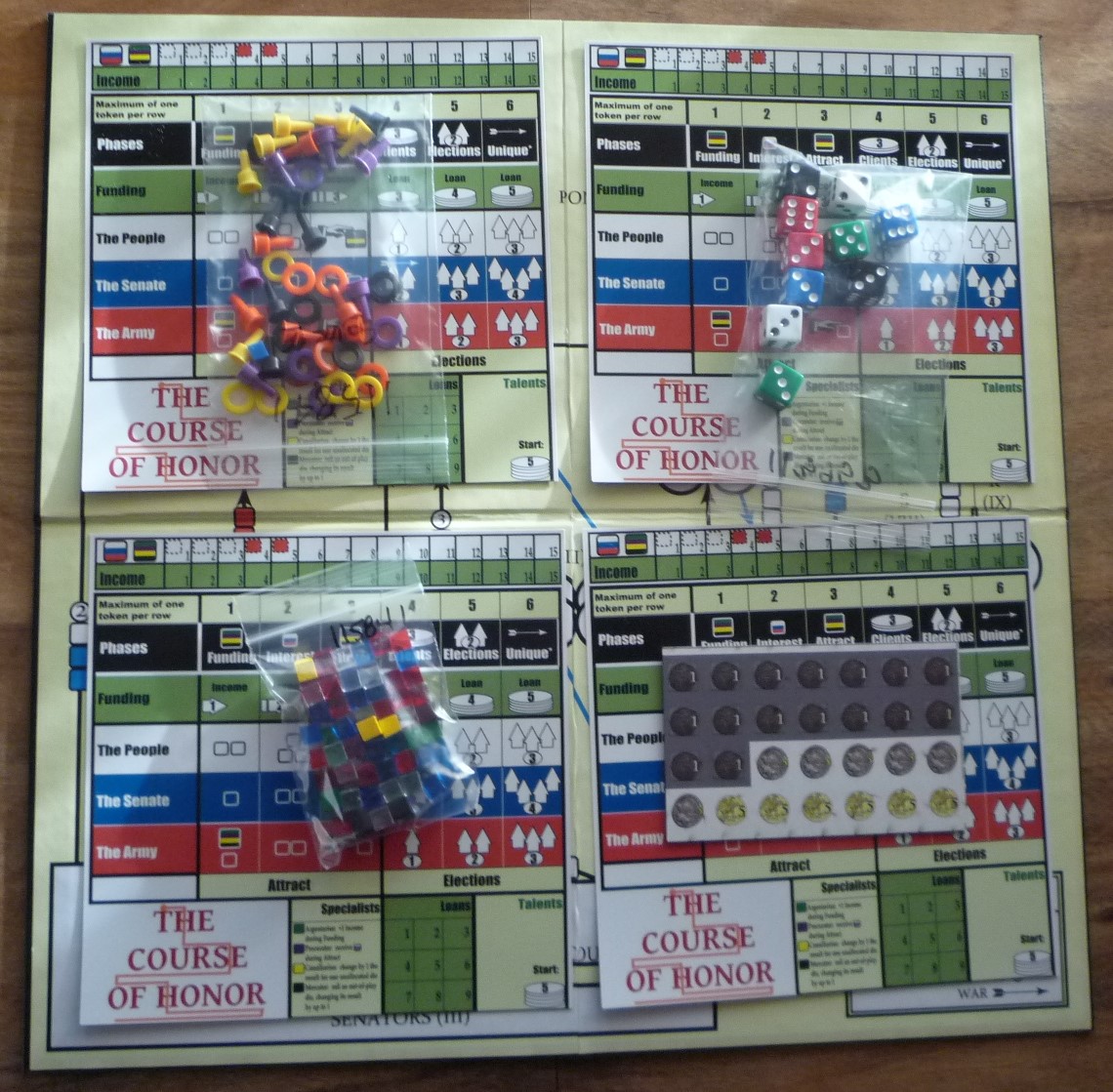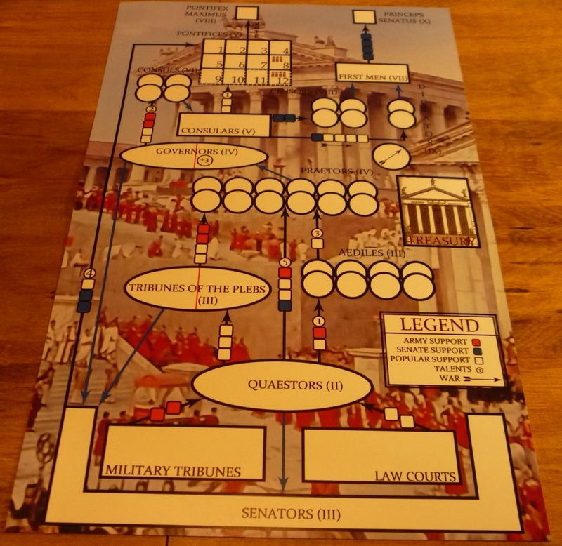 The game includes two dice in each of five colors representing the support of the people, armies and Senate, plus money and time.