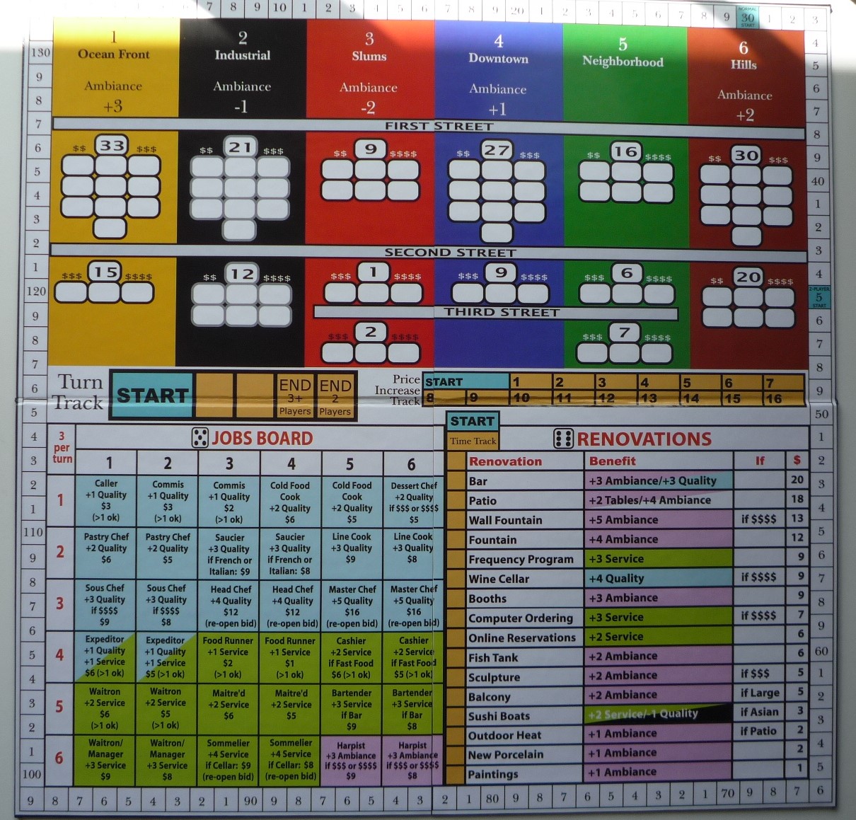 Customer visits are determined by a new gaming mechanism called the Payouts Chart, in which players roll 15 dice and place them in a unique way to determine which restaurants the fickle public taste adores.