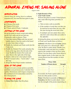 Admiral Zheng He: Sailing Alone is a small, solitaire expansion consisting of just 18 cards and 4 pages of rules, much of it historical background.