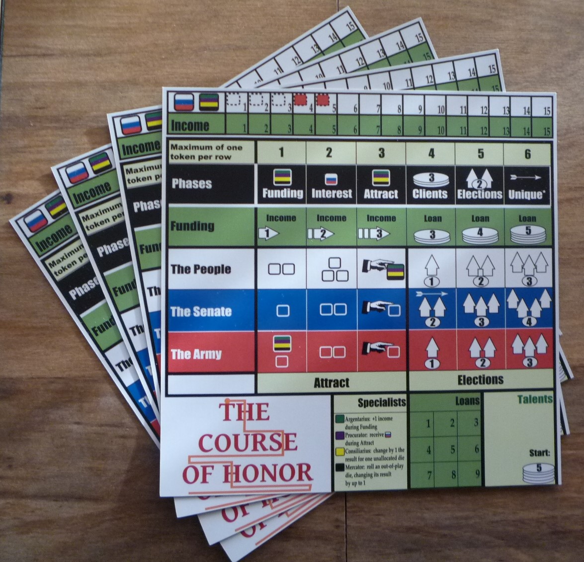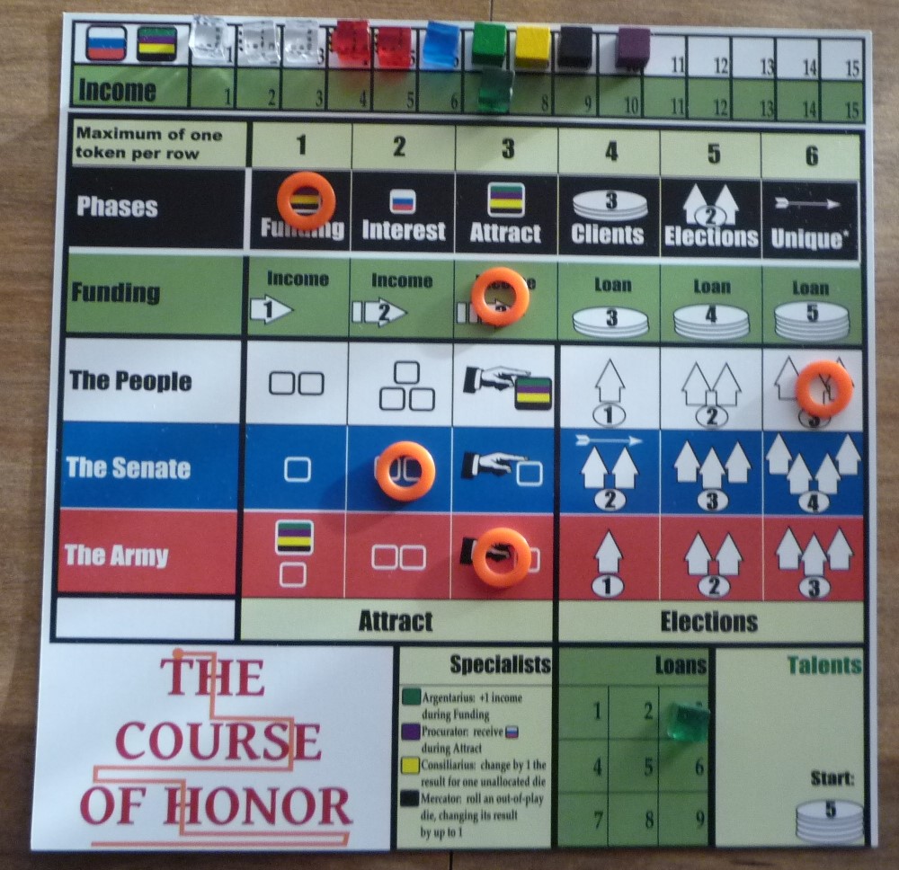 The game includes two dice in each of five colors representing the support of the people, armies and Senate, plus money and time.