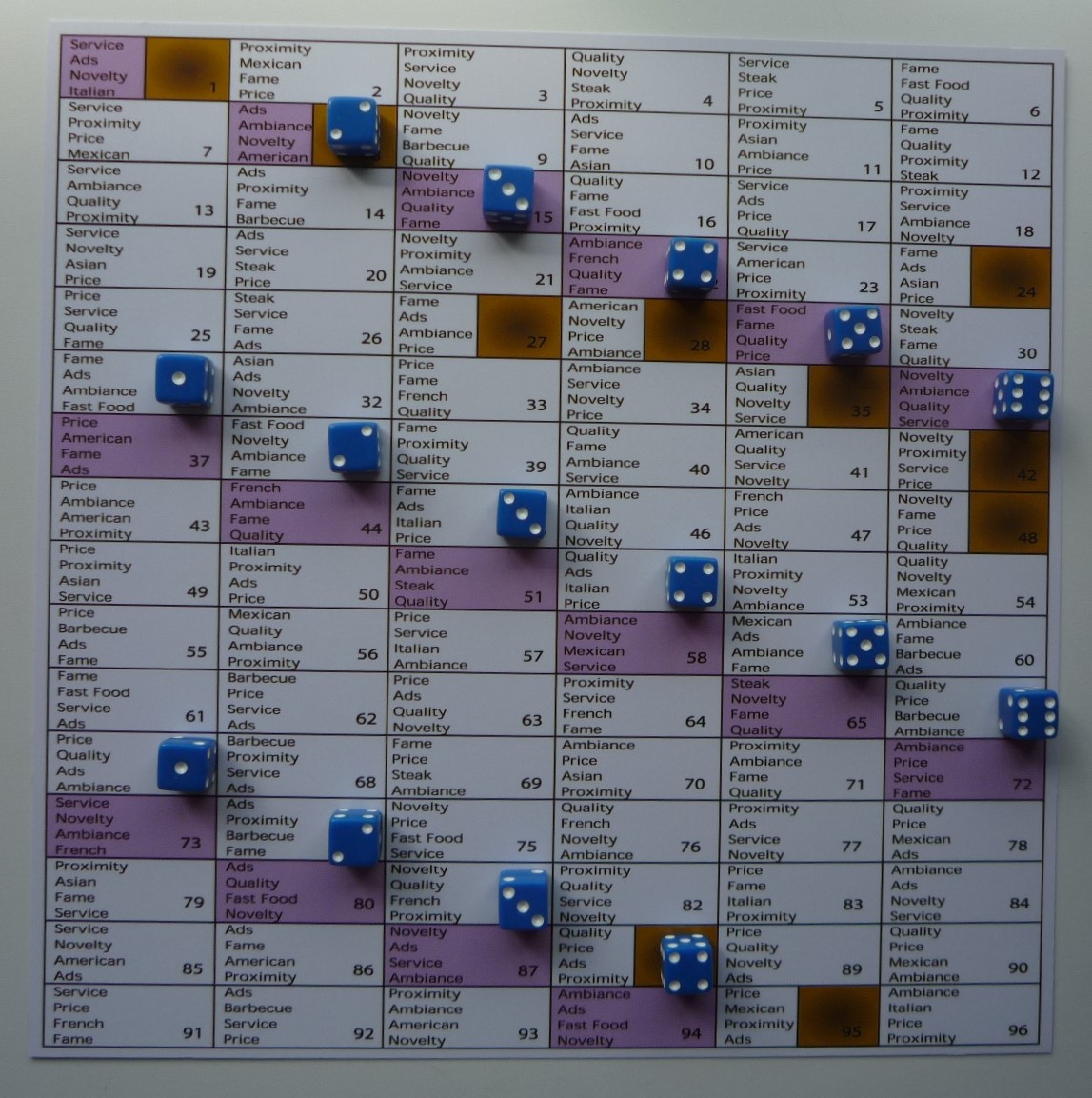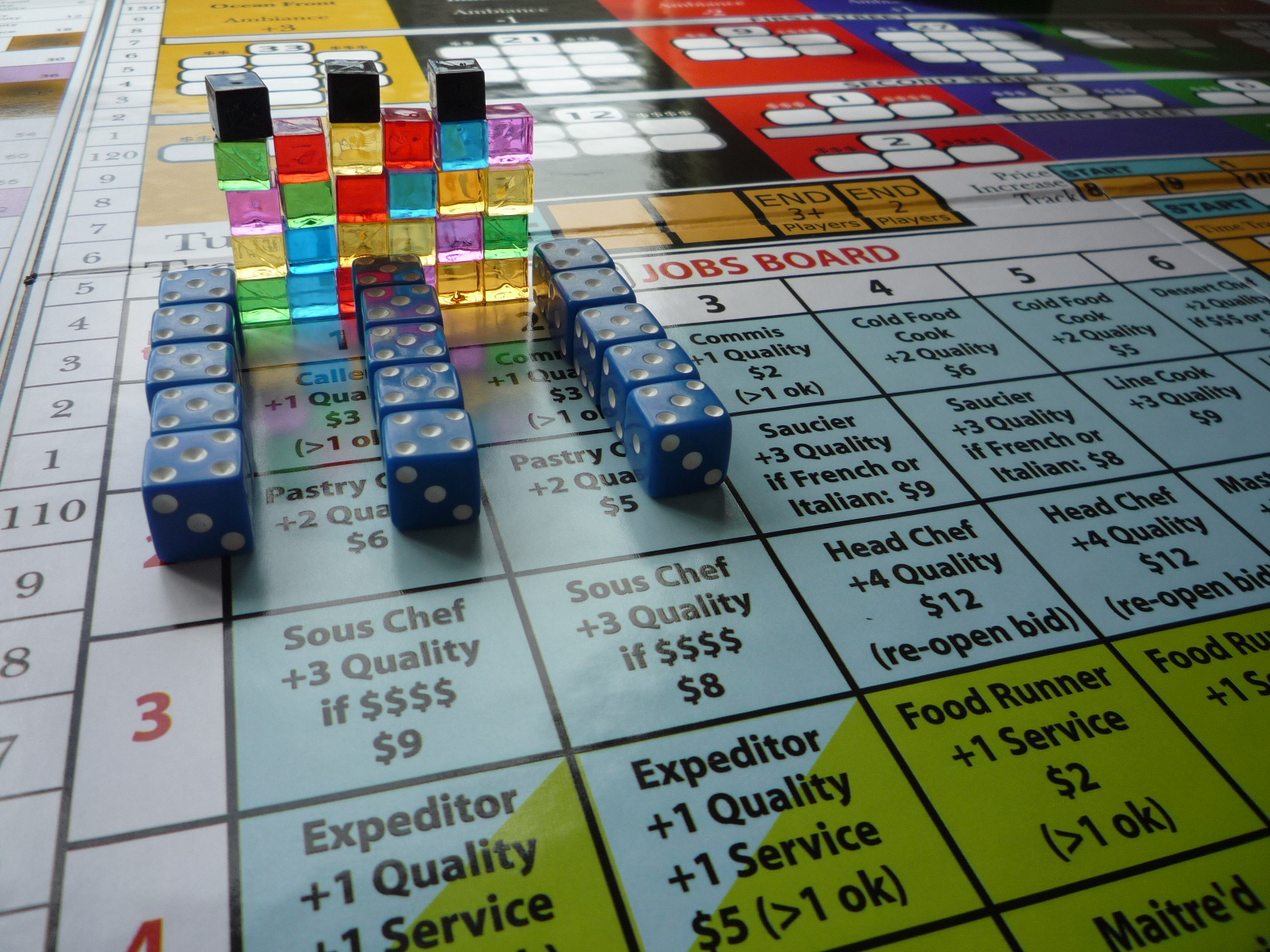 Customer visits are determined by a new gaming mechanism called the Payouts Chart, in which players roll 15 dice and place them in a unique way to determine which restaurants the fickle public taste adores.